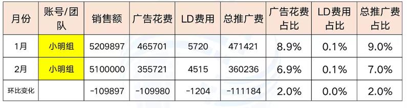 分析:2月份环比1月份,整体费用占比下降2%,其中主要是广告费用下降了2%,花费下降了近11万。