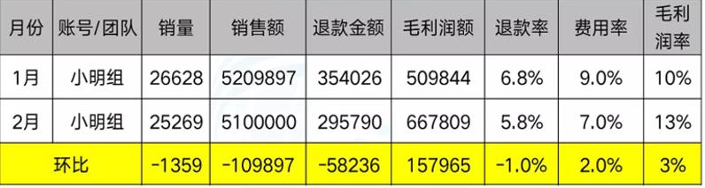 分析:2月份环比1月份,销售额下降11万,利润增长15.7万,退货率下降1%,费用率下降2%。利润增长就出自这两个部分!
