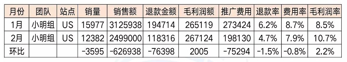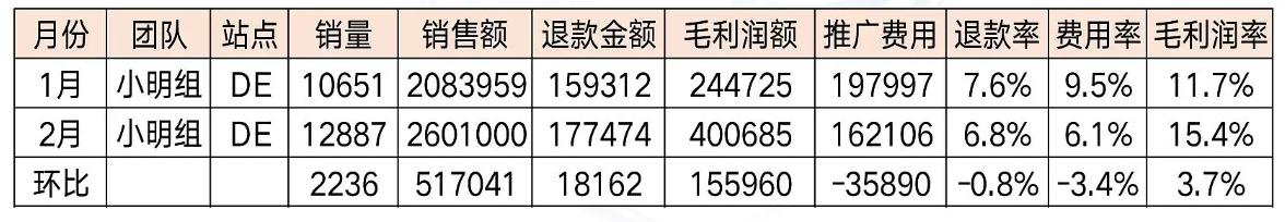 以此类推,再深入到每个站点的SKU数据表现,通过数据的层层剖析,最后形成系列总结,并同步分析原因。比如(销售额、销量、利润额、费用、退款、流量、转化率、广告等)