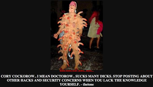 BoingBoing.net 被黑了。打开首页你可以看到一幅不雅的图片,图片下方对网站编辑Cory Doctorow进行了谴责,警告他不要在黑客和安全问题上不懂装懂。攻击者署名“the lone”。