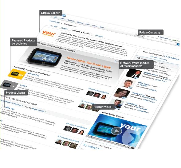 在公司简介页面,管理员可以添加服务或产品标签。比如会计公司就可以添加其所提供的各种金融服务标签。更为先进的是,这些页面会根据浏览会员的不同而自动显示差异化内容:比如对航空业的会计师展示一种服务或产品,而对运输业的工程师显示另外一种。