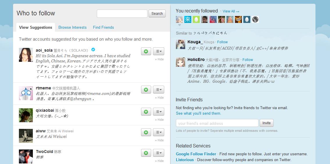 在右侧还可以通过邮件邀请你的朋友加入Twitter,下面还有一些类似的帮助寻找值得关注的人或者好友的服务,比如Google Follow Finder,Listorious等。