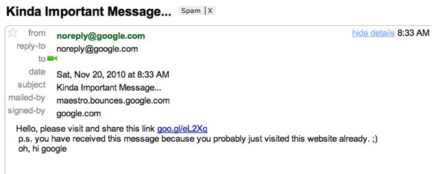 演示网站,任何已经登录Google账户的用户当访问这个网站时,会导致账户信息泄露。而用户的Gmail账号会收到一封邮件告知原因。