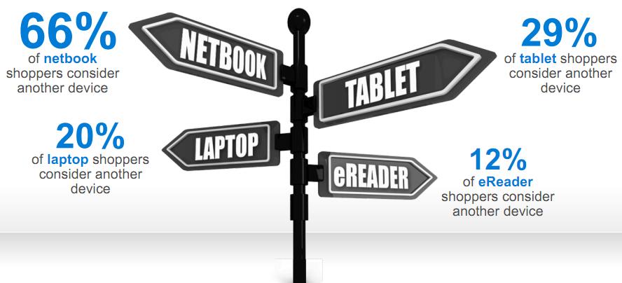 49%买家在购买新设备之前不知道到底想买什么。66%上网本用户打算换一种设备;29%平板电脑用户打算换另一种设备;20%笔记本用户打算换另一种设备;12%电子阅读器用户打算换另一种设备。