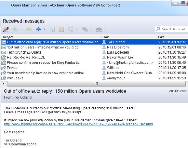 显然,这不是他本人的真实邮箱,而是Opera营销团队的一个创意。查看收件箱内容你可以看到:Opera用户数已经达到1.5亿的里程碑。