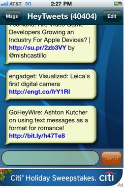 MediaFriends开发的一款免费的短信服务,今天HeyWire联合Twitter开始在全球范围内提供一歌名为“嘿推(HeyTweet)” 的服务,允许用户通过手机短息发送免费推讯。