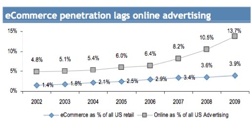不过零售商向网络端迁移的速度,比不上广告商向互联网迁移的速度。从下图可以看出,2009年,电子商务占全美零售额的3.9%,而在线广告占全美广告额的13.7%。