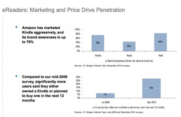 亚马逊的Kindle广告宣传非常到位,Kindle品牌识别度达76%,接近iPad的84%,远远高于其竞争对手Nook(45%)。28%受访者表示称拥有Kindle,或打算在未来12个月内购买Kindle,2009年7月,这一比例仅为7%。