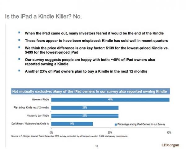 Kindle和iPad截然不同。JP Morgan的互联网团队对1000名用户进行了调查,发现,40%iPad用户同样拥有一部Kindle。另有23%iPad用户打算在未来12个月中买一台Kindle。
