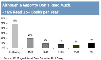 Kindle对书虫的诱惑力很多,这是一个利润颇丰的细分市场。大约有一半受访者表示每年读0-10本书,16%表示每年读25本以上图书。