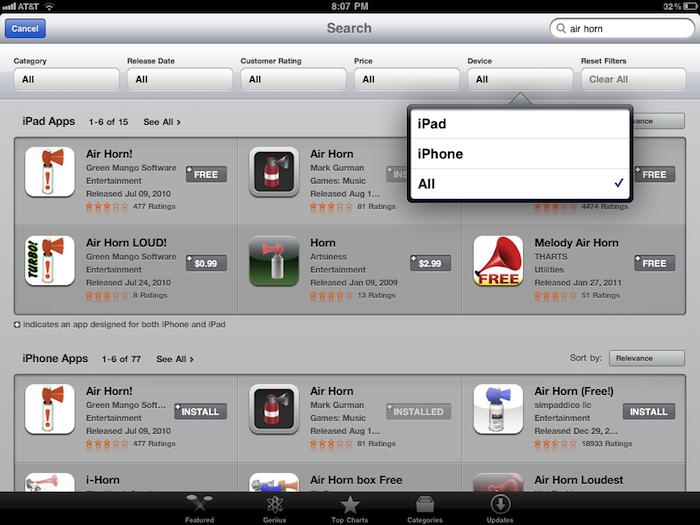 苹果刚刚更新了iPad应用商店,为其增加了一个新的搜索过滤功能。这个新功能允许用户根据分类、发布日期、用户打分、价格等条件对应用进行搜索。