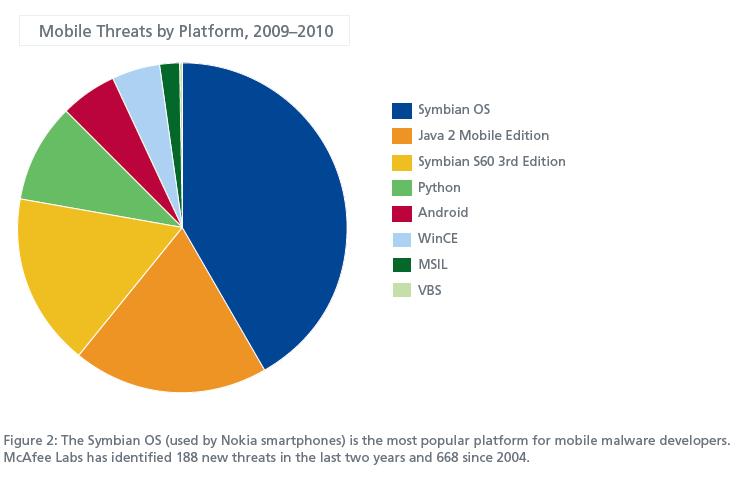 图一:移动平台面临的威胁(从高到低依次为:塞班OS,Java 2移动版本,S60V3,python,Android,WinCE,MSIL,VBS)