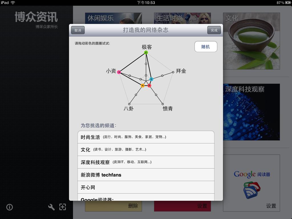 Google阅读器的内容。设置方面,新版“博众资讯”保留了之前版本中个性化的频道定义方式(定制频道只要拖动下图的“八卦阵”就可以啦)。