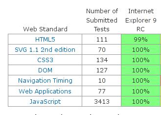 提供的W3C测试结果。IE9真的支持99%的HTML5标准吗?非也。那只是微软测试驱动开发(TDD)过程中自己创建的单元测试(Unit Test),那是为他们量身定做的,当然能通过。我们也有自己的单元测试。而对于