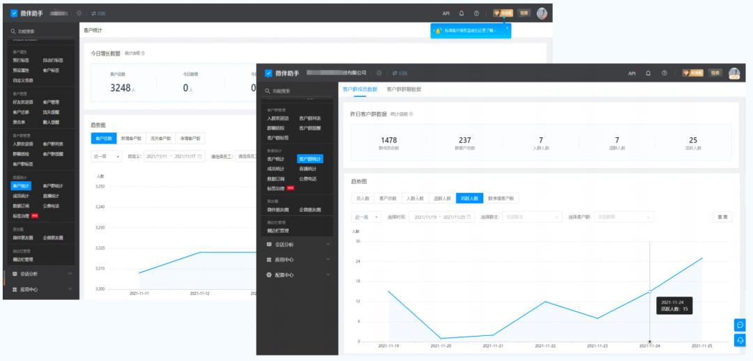 一方面,企业微信有获取「客户详情」和「客户群」的用户数据功能,通过该功能,企业能够清楚地看到不同标签用户的增长情况。