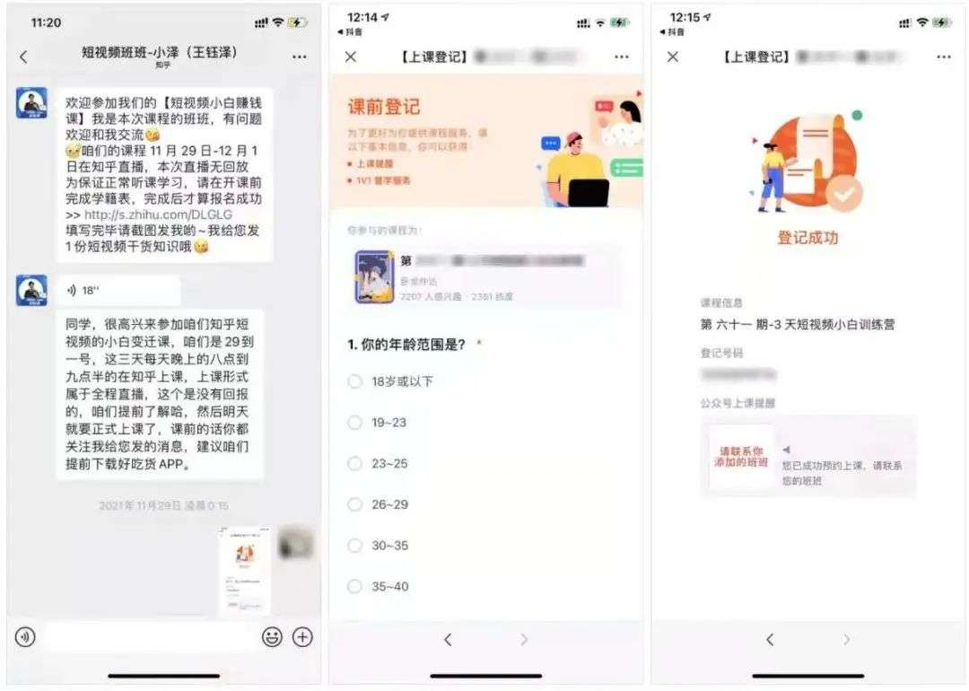 再比如,知乎短视频培训班的课前问卷,会通过对用户的年龄范围、对短视频的了解程度,以及学习短视频的目的等进行“摸底”。