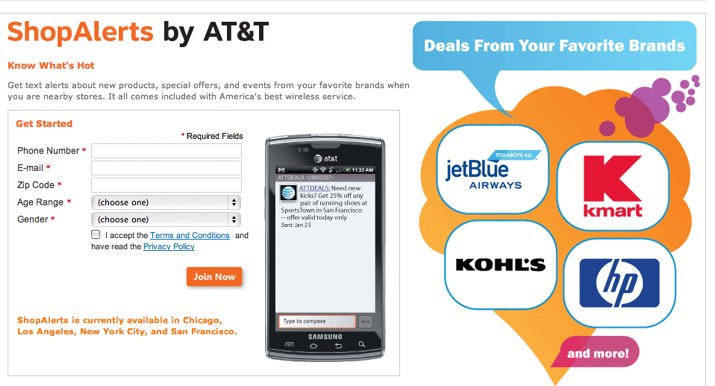 AT&T联合Placecast推出了一款基于移动地理位置的商家信息推送服务。此项服务名为ShopAlerts,当接近某些品牌的(如HP, KMart和JetBlue)商店后,用户的手机会收到相关的特惠或打折信息。