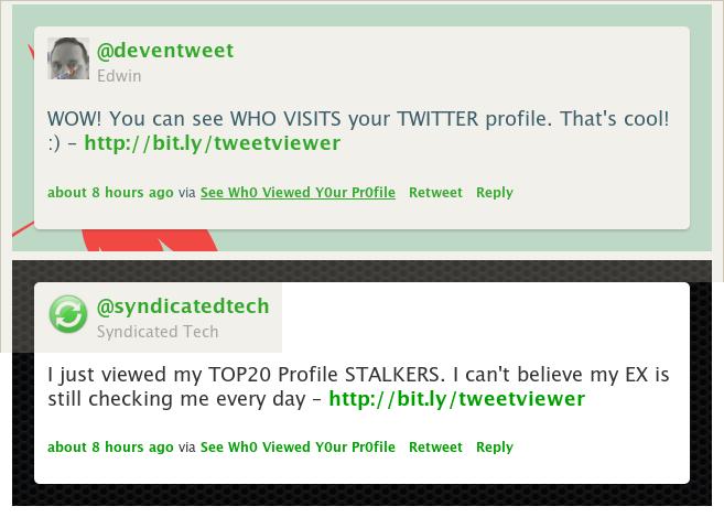 再一次在Twitter上被利用,有人发了这样一条推:“Wow,你可以看到谁访问过你的Twitter Profile页面,帅呆了! :) - http://bit.ly/tweetviewerTwitter”还有“我刚刚看了浏览我 Profile页面最多的20个人,没想到我的前男友每天都在查看我的Tweets。”这样的Tweets今早以每分钟159条的速度在传播。