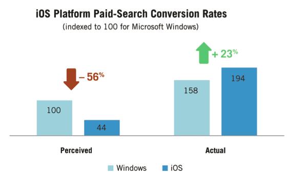 不过该报告也显示,如果这些付费搜索点击都能被有效追踪,则苹果设备上的实际转换率要大大高于Windows设备上的实际转换率。如下图就显示其实际转换率超过Windows设备23%。