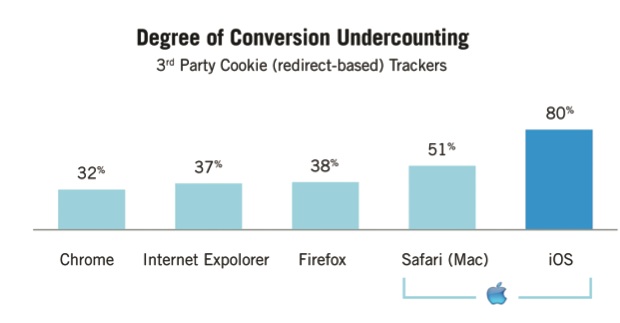 调研显示,由于其主要安装的是默认状态下对Cookies数据进行拦截的Safari浏览器,使得其付费搜索转换量(例如点击付费)有近8成无法正常统计。单就Mac而言,该流失数也有50%。如果对市面上的所有浏览器进行付费搜索转换流失的计算,则流失率约为38%。