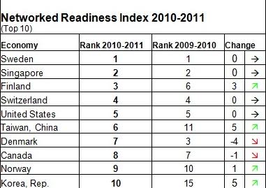 世界经济论坛发布的一份报告显示在信息与传播技术经济表现方面排在前三位的分别是:瑞典,新加坡和芬兰。