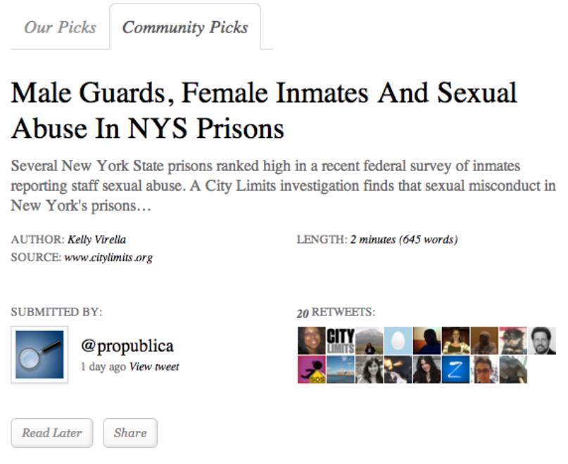 #longreads”的Tweets,并对抓取这些内容,进行的机器排序后显示出来。这个版块还给了所有发布、分享这些文章的读者展现自己的机会,如上图所示,文章底部都会显示提交者和分享者。由于每天Longreads 只推3到5篇文章,对于这些提交者来说,展现的概率特别大,也因此很好的激励他们不断的提交这些文章,确保了社区的持续发展。