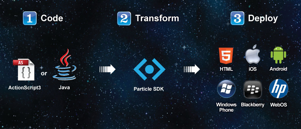 Particle Code 正在开发一个通用平台,帮助移动开发者一次性编写移动应用和游戏,然后部署为本地应用和HTML5网络应用,从而在不同的设备和平台上运行,所有部署都通过唯一的代码库完成。其诀窍在于在源码层面上进行译码,从而让网络应用的表现接近本地代码实现的效果,而不是在本地扩展中对JavaScript进行封装。如果也就是说用Java编写的程序可以部署为Windows Phone 上的本地 C# 应用。