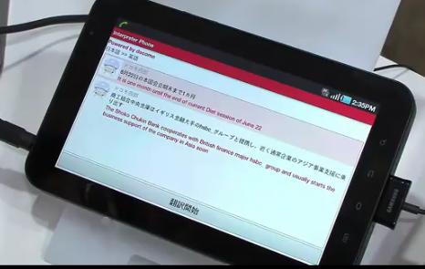 在演示过程中Docomo的工作人员大声朗读着一份日语报纸,然后接收设备则可以实时将其翻译成英语。据该公司表示,该项技术的成功使用结合了语音识别,机器翻译和语音合成等多项尖端技术。