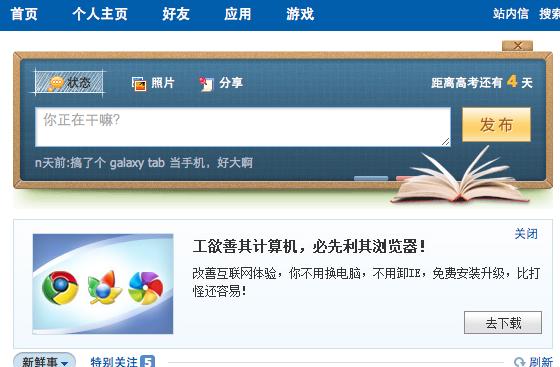 人人网的朋友应该会在登陆后的首页看到一个「工欲善其计算机,必先利其浏览器」的产品广告(如下图)。这是人人最新推出的人人版浏览器,其中集成了多项人人功能,理念类似此前我们报道的全球首款