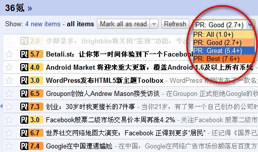 浏览器扩展,安装了PostRank扩展之后,打开Google Reader,你就可以看到每篇文章前面多了一个分值(满分为10),分数越高,说明讨论这篇文章的人越多,被人关注的越多,往往也是网络热点和精华。然后你可以根据PostRank分值对文章进行过滤,分为所有(All)、还成(good)、不错(great)、特好(best),四个等级。