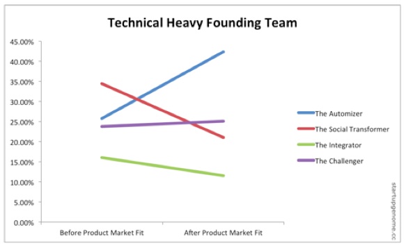 在我们的数据中,35%的偏重商业的创始团队在产品适应市场之前选择了“自主型“,但在产品适应市场之后只有12%的偏重商业的创始团队选择了”自主型“。这说明偏重商业型的创始团队并不太适应”自主型“的创业公司。