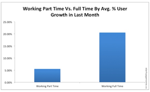 我们经常听人说,筹到资金之前他们会兼职工作。下面的图表里显示兼职工作的创业者平均筹集到的资金,比全职工作的创业者少24倍。而且,兼职创业者难以保持足够的活动频度(比如产品更新,营销)来推动用户数量的增长,市场也往往通过这个来验证产品是否足够吸引人。全职工作对于需要达到用户数量的临界质量才能体现网络效应的产品创业型公司来说尤其重要(比如人人,微博)。