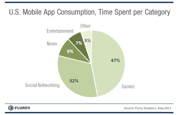 那么人们都是花在哪些应用上了呢?从Flurry抓取的数据来看,游戏和社交网络占统治地位,分别每天占47%和32%,这2项就花了人们使用移动应用79%的时间,新闻则占据了9%左右。