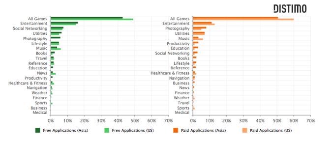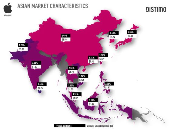 报告还显示,日本贡献了亚洲地区大部分的应用收入。亚洲地区的应用总收入约为美国的2/3,该数字高于上文提到的1/3的付费下载比率,因为亚洲地区的前300种最受欢迎的应用的平均售价为2.62美元远高于美国的1.48美元。