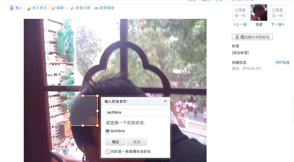 最后一个圈人功能,当你去参加了一个活动,跟几个朋友一起照相,你可以分别将他们圈出来,圈出对方后对方会收到@通知,让更多的人参与到互动与讨论中,典型的SNS功能。