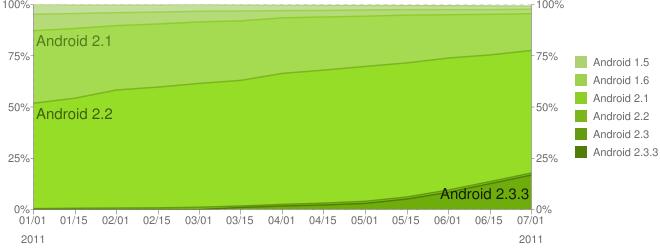 根据最新的统计数据显示,Android 2.2仍是使用最多的版本,2.3.3和2.3.4在不断增加。另一个比较明显的趋势是2.2版用户大部分都没有升级到最新版本。