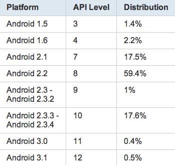 与此同时,第一代Android平板电脑(目前包括3.0和3.1两个版本)份额有限,装有3.0的平板电脑在Android设备中只占0.4%,装有3.1的平板电脑仅占0.5%,两者加在一起还没有Android 1.5(两年多以前发布的版本)用户多。