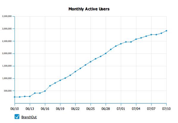 同时,Facebook为Branchout用户提供了一个现成的关系网。然而,如果你是LinkedIn新手,你就需花更多的时间来构建自己的关系网。虽然LinkedIn有转移email联系方式等一些不错的功能,但是,对于很多人来说,他们并不经常使用email。现在朋友间最常使用的联系方式还是Facebook。因此,虽然LinkedIn与BranchOut的实际用户数的差距还是很大,但BranchOut用户的增长速度惊人: