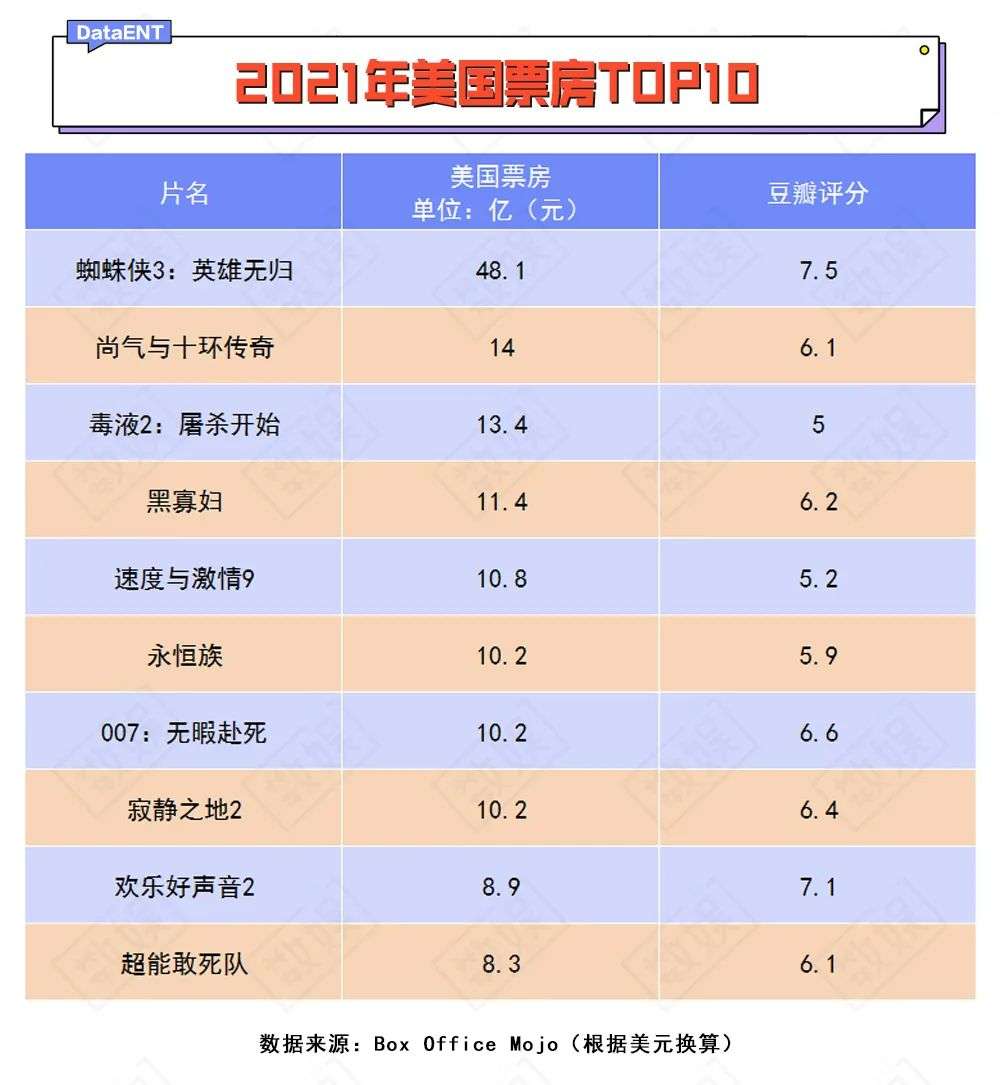 其次是质量,放眼整个美国市场,近几年,真正意义上的现象级爆款作品亦寥寥无几。而究其原因,是因为好莱坞自身创作能力的减弱,毫无新意的翻拍、衍生、续集作品大行其道,让观众逐渐产生审美疲劳。具体来说,在2021年美国票房TOP10中,豆瓣7分以上的作品仅有《蜘蛛侠3:英雄无归》和《欢乐好声音2》2部,其他大部分作品都徘徊在及格线附近。且不说在国内遭遇差评的《速度与激情9》,就连一向以质量著称的漫威系列电影也在口碑上接连遭遇滑铁卢。