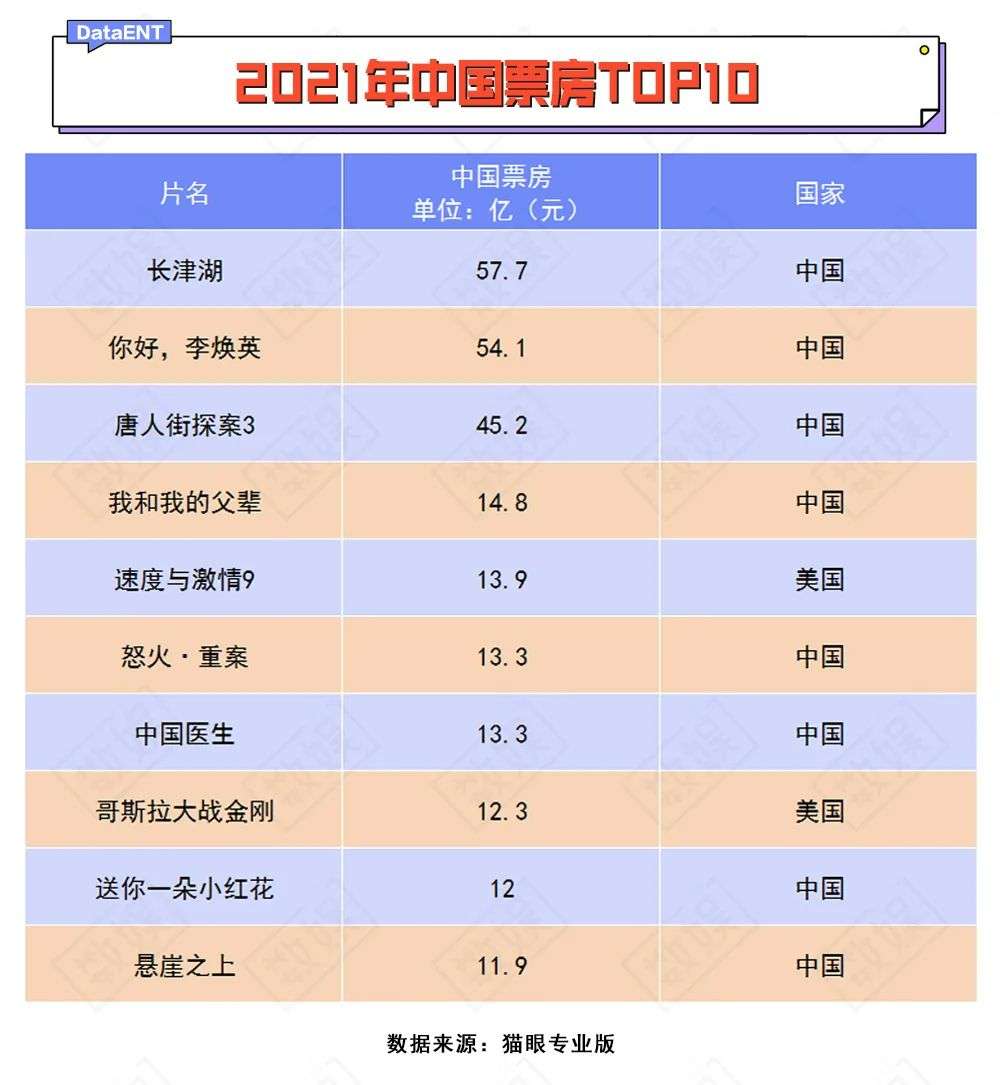 具体来说,在2021年中国票房TOP10中,国产片占到了8部,票房破40亿的有3部,破10亿的有5部。其中,《长津湖》不仅是去年票房最高的电影,更刷新了中国电影的票房纪录,超越《战狼2》成为了中国影史票房第一的作品。相比之下,打入TOP10的进口片仅有《速度与激情9》和《哥斯拉大战金刚》2部,其票房亦无法与头部国产片相提并论。