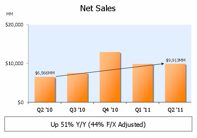 亚马逊第二季度的财报数据显示,公司迎来了10年来销售最旺的一段时期。在今年第二季度,公司的净销售额达到99.1亿美元,而2010年第二季度的净销售额仅为65.7亿美元,同比增长51%。
