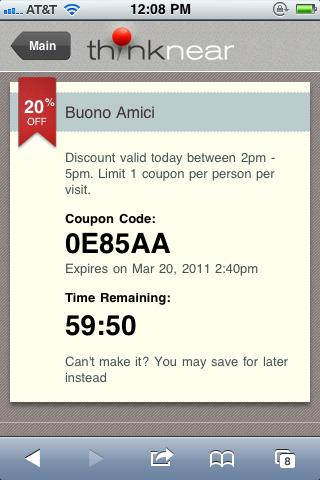 不同于Groupon,LivingSocial等在产生客流方面的不确定性,ThinkNear主要是基于本地商家在某个时间点的现有客流量来给附近的手机推送折扣信息。比如说某家商店在中午的时候,客流量较少,Thinknear则会向附近的手机推送限时折扣5折,而到了晚上,客流量还不错,其推送的限时折扣则变为7折。总之该系统会根据该商家的客流信息自动做出推送调整。另外该系统还会考虑交通,天气,附近的活动等各种情况来综合决定推送什么样的折扣通知。