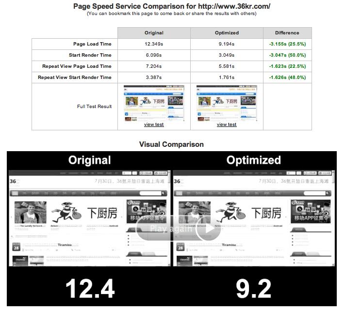 以下是36氪的测试结果,我们可以看到经过优化以后页面加载时间从12.4秒减少到9.2秒。