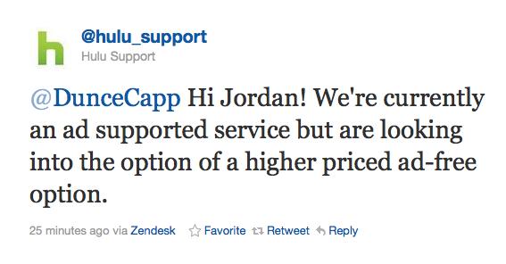 Hulu的付费用户对服务中的广告颇有微词,最近,Hulu Support的twitter账户发布了几则消息作为回应,很引人关注: “我们有支持广告的服务,但也正考虑提供一个无广告但价格较高的服务” 。