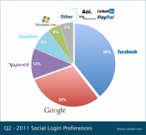 为了增加网站注册人数,促进用户互动,各品牌公司和网站站长们开始整合社交网络登陆账户。在第二季度Facebook依然是最流行的社交登陆服务,但它正面临着激烈的挑战。