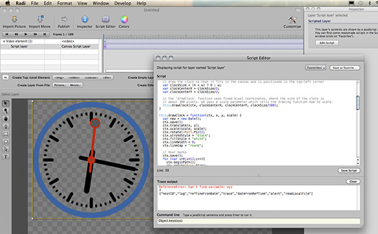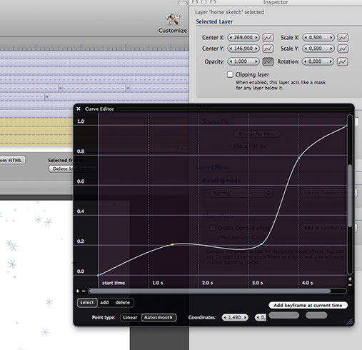 在Radi中实现动画效果很简单,打开一个图层,点击时间线上的帧,修改图层属性既可以自动生成关键帧。Radi还有一个浮动的曲线编辑器,可对动画时间进行更精确的控制。