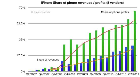 不仅如此,上图反映的数据更是一个不可忽视的真相,今年第二季度,Apple在移动手机获得的利润已占市场总利润的66%,而其它主要手机商的利润之和也仅占市场总利润的33%左右(实际上,Nokia,Motorola,LG和Sony都已亏损),不知Google对此作何感想。