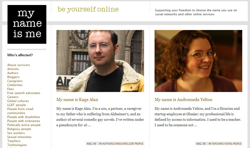 在其网站上,他们最显眼的就是,“在网上,做自己”(be yourself online)的标题,然后下面是一些支持者的故事。他们认为在网上选择自己的名字并不代表你就是骗子或者垃圾邮件发送者,自己选择名字只是意味着你想人家接受像你名字一样的你:你是你说的那样的人(you are who you say you are)。