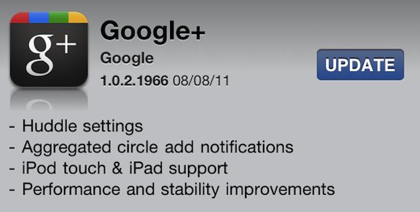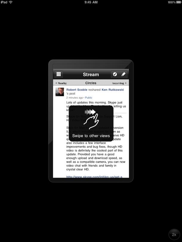此次Google+ for iOS的更新还有增加Huddle设置,改善的被圈提醒和综合性能的提升。需要指出的是,目前并没有真正的Google+ for iPad。此前发布的Google+ for iOS仅用于iPhone上,被限制在iPad上使用。(发布后,网络上有相关的破解方法流出让Google+ for iOS在iPad上使用)这次的更新其实是让你可以在iPad和iPod touch上使用Google+ for iPhone。如果你在iPad上使用Google+会呈现下面的效果。