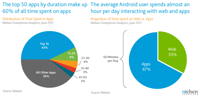 Android应用现在有25万之巨,但是其市场分配如何呢?近日Nielsen一份研究表明:10款最流行的Android应用占据了Android手机用户花在所有应用的时间上的43%。如果将范围扩展到前50名的应用,那么这一时间占比将上升到61%。